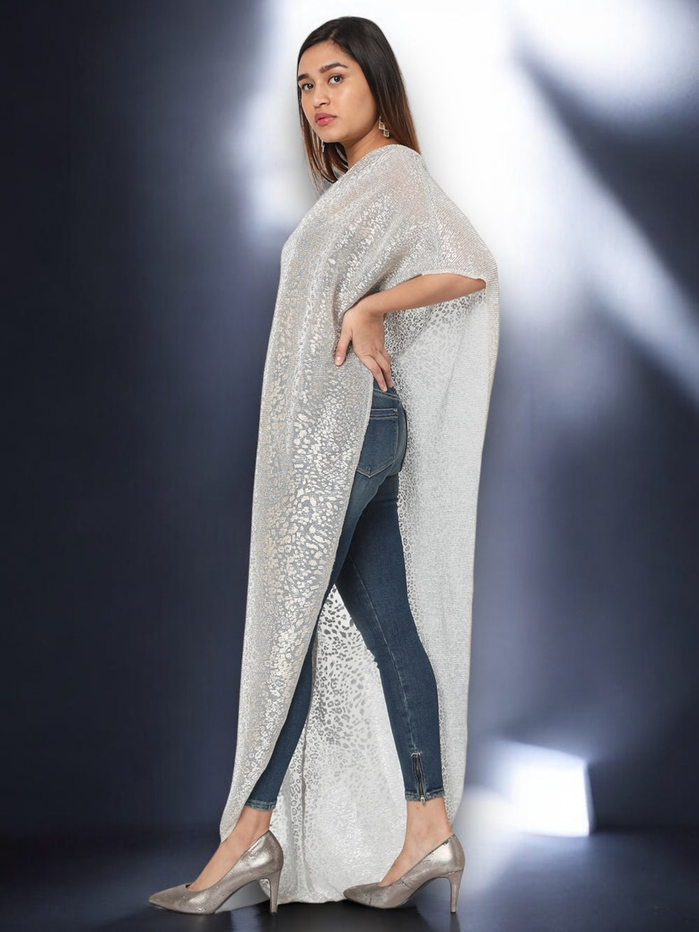 One shoulder sheer grey and blue shimmer cape made in soft poly crushed fabric. This cape is nothing less than a flowly dream and a must-pack for your next summer holiday or the big brunch party. A multi-utility product which can be used as a resort wear on top of your swimwear, can be paired with shorts and a tube top or as an evening wear with tight pants and a bustier. It is translucent and comes without an inner.