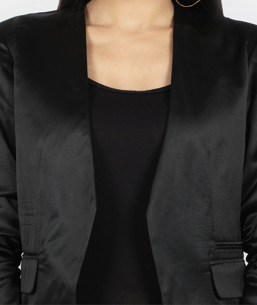 This blazer is a perfect choice for the working women who pull off a 9 am to 9 pm day without changing. The black solid colour makes this look formal and smart creating a great impression at work. It also works great for the post work outings and parties because of the subtle shine created by the satin fabric and the fashionable wrinkled sleeves. A perfect choice for the hard-working urban lady!