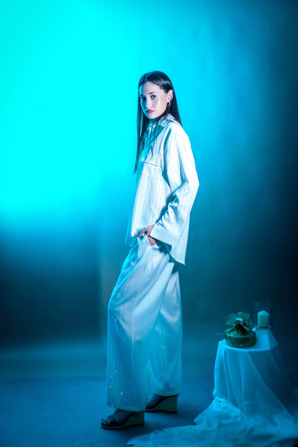 Grace meets ease in the Divine Diamond Co-ord Set, a luminous co-ord crafted from rich satin modal for an ultra-smooth, elegant drape. Designed in pristine white, both the relaxed-fit shirt and pants feature vertical diamond-studded lines that subtly catch the light—adding a refined touch of sparkle to a soft, modern silhouette.