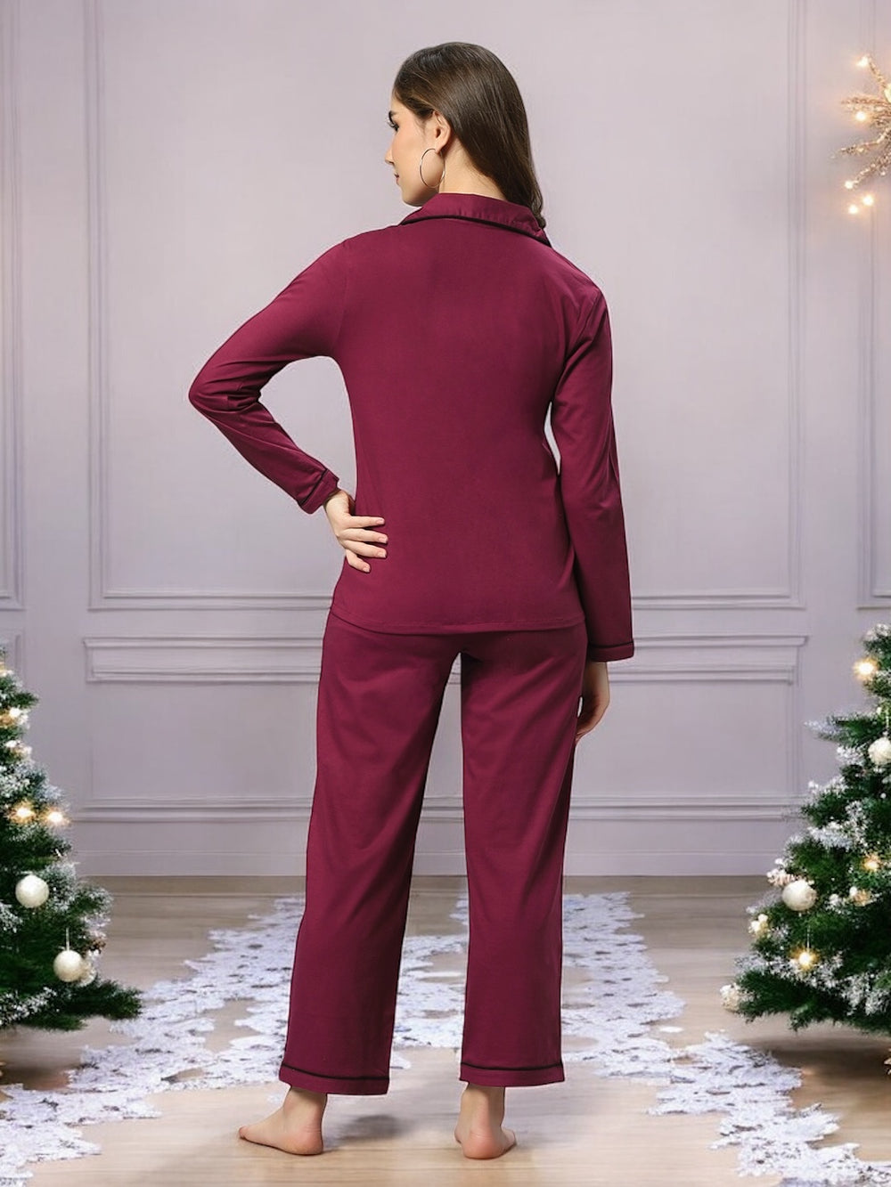 Grab your hands on these super comfy and cute elf Nightsuit set. Perfect for your Christmas nights this button down shirt with collar neck will keep you cozy with full length py which has soft elastic. This cotton maroon Nightsuit set will give you the comfort and make you feel warm throughout the winter nights.