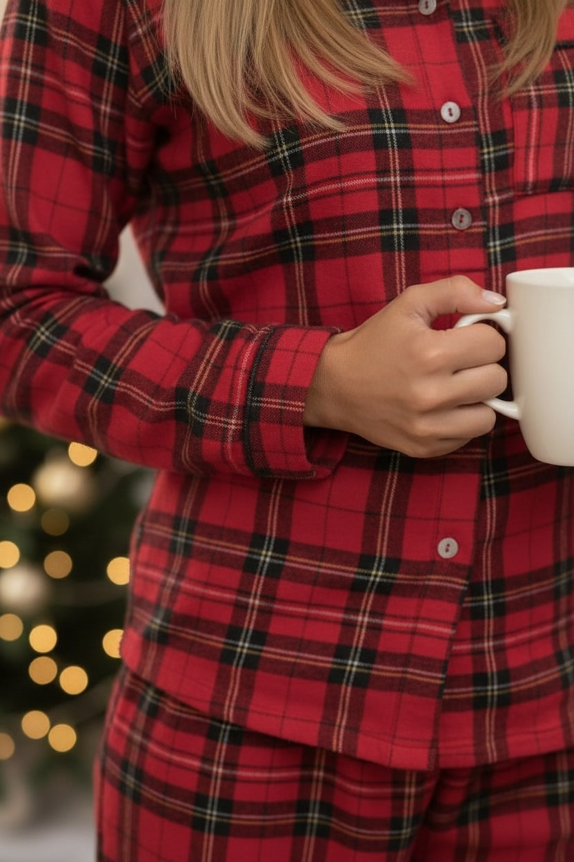 Super Soft and cosy warm cotton Scottish checked nightsuit set is a must-have for the cosy Christmas night. The shirt comes with a collar, front buttons and full sleeves. It is paired with pyjamas with which relaxed fit and come with an all round elastic on the waist. The fabric is super soft and rich and will make you feel very comfortable all night. Premium nightwear for holidays, occasions and slumber parties. For personalisation and bulk orders, contact us on +919324818483