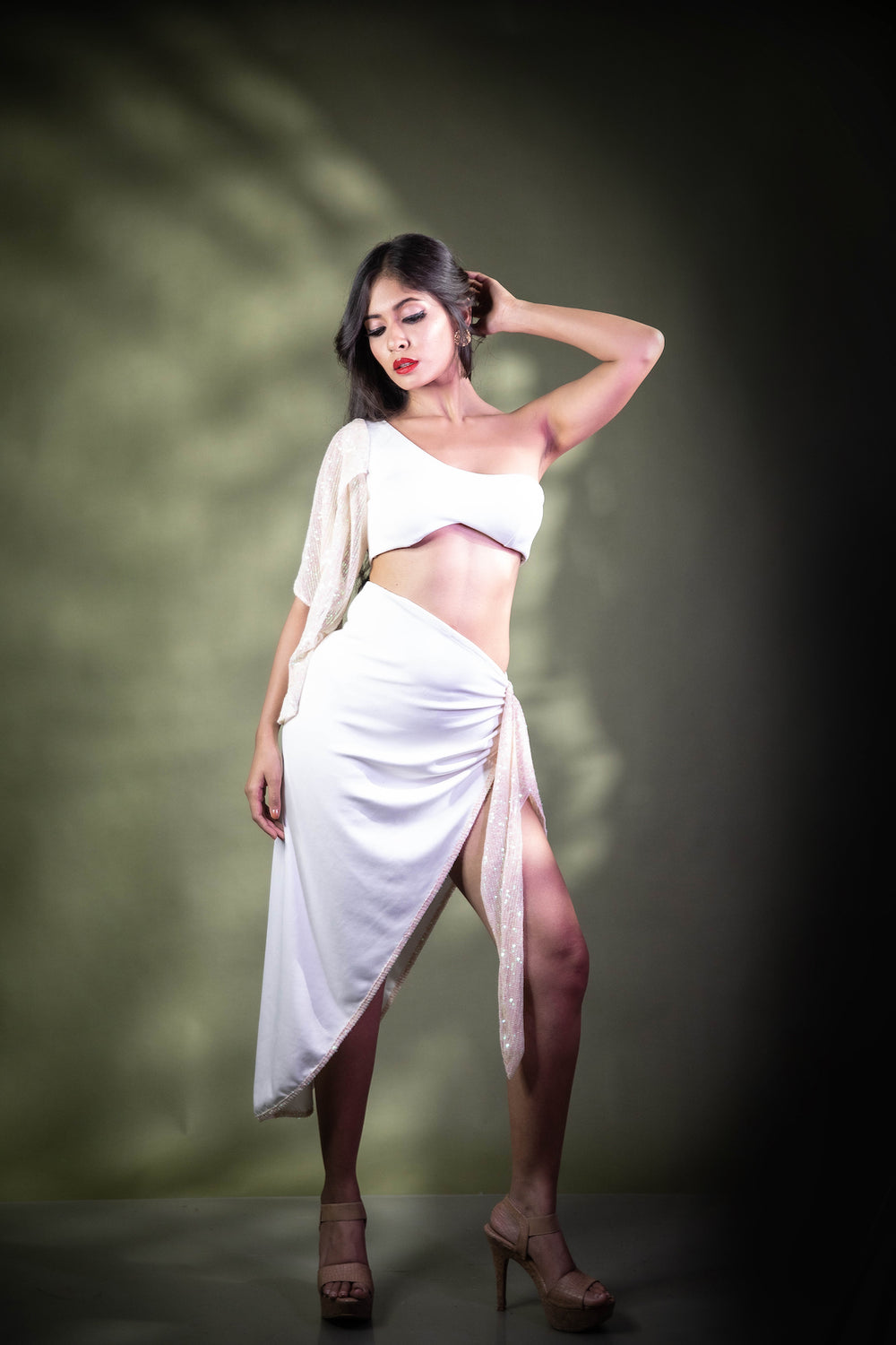 The Cover-Up Skirt: The white cover-up skirt is the perfect complement to the bikini, featuring a sleek slit and sequins at the edges for an extra touch of glamour. Crafted from stretchy lycra fabric, it hugs your curves and defines your silhouette, making it as stylish as it is comfortable.