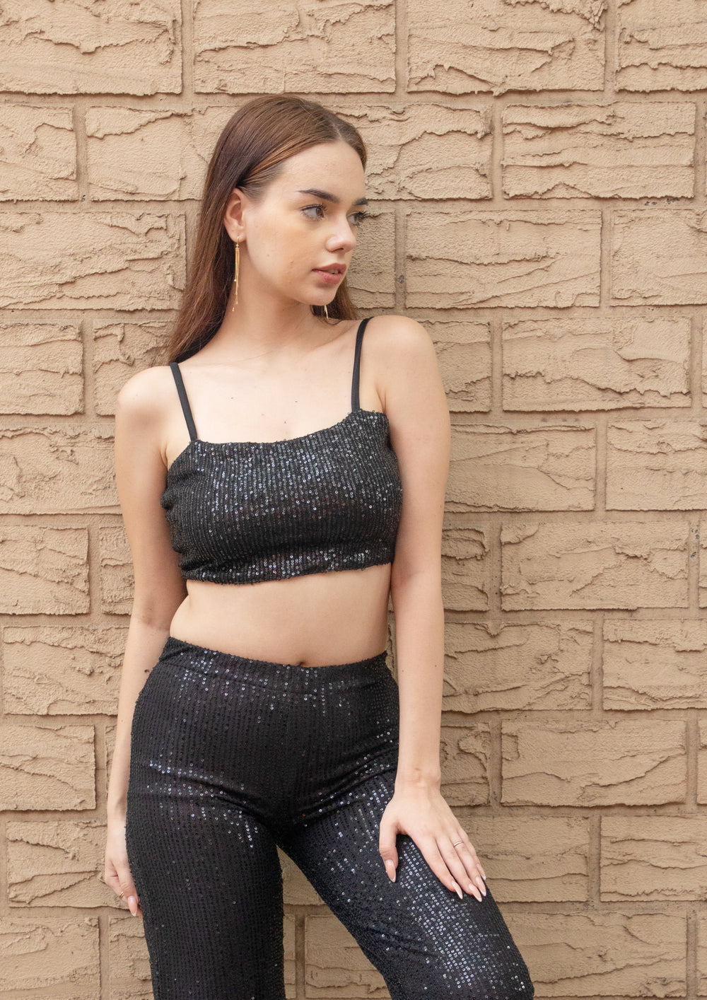 It's time to look fashionable and funky. The all new sexy black sequins cami cropped top is a must-have for the party season if you want to rule the fashion space. Made in stretchable sequin, this cami top has a deep straight neckline and thin straps with a straight low back. It has a lycra stretchable lining and it is not see through. It does not have any opening and it is stretchable. You can wear a strapless bra inside it and it is not padded. Pair it with our black sequins stretchable pants and black sequins sheer shirt to complete the look. OR wear this top with absolutely anything below and you are good to go!