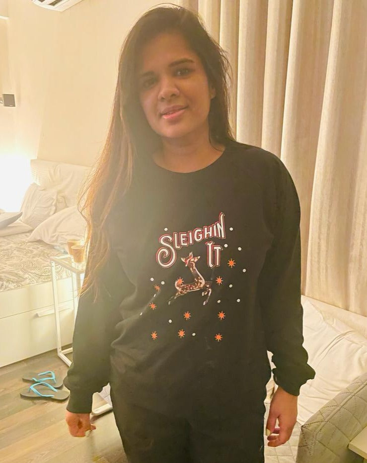Black unisex sweatshirt with a white text 'Sleighin It' with a reindeer printed, is a comfortable cosy pick for the Christmas celebration at home or outdoor this year. Made in 100% knitted cotton, this sweatshirt will make you feel good and warm. Full sleeves and a high round neck. Only available for the slayers!