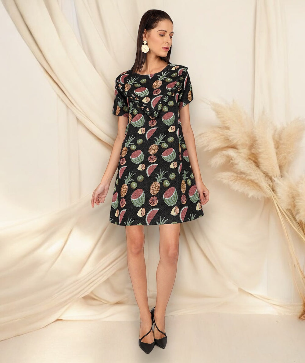 Premium thick jacquard fabric with fruit print all over. This shift dress comes with half sleeves, round neck and a V frilled neck. The length is above the knee and is a good fit to make it a perfect winter formal dress.